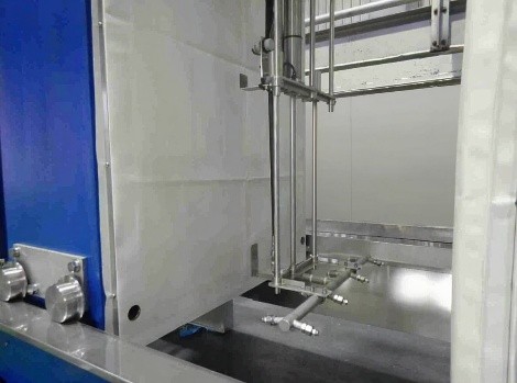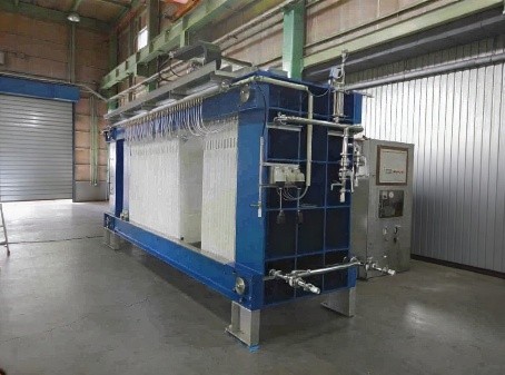 オプションとして開枠洗浄装置を導入いただいております。これにより、濾布を自動で洗浄することができ、従来の人の手による洗浄と比べて洗浄ムラを抑えることが可能です。これにより、ろ過性能の安定化と歩留まりの向上が期待されるとともに、作業負担の軽減にもつながります。